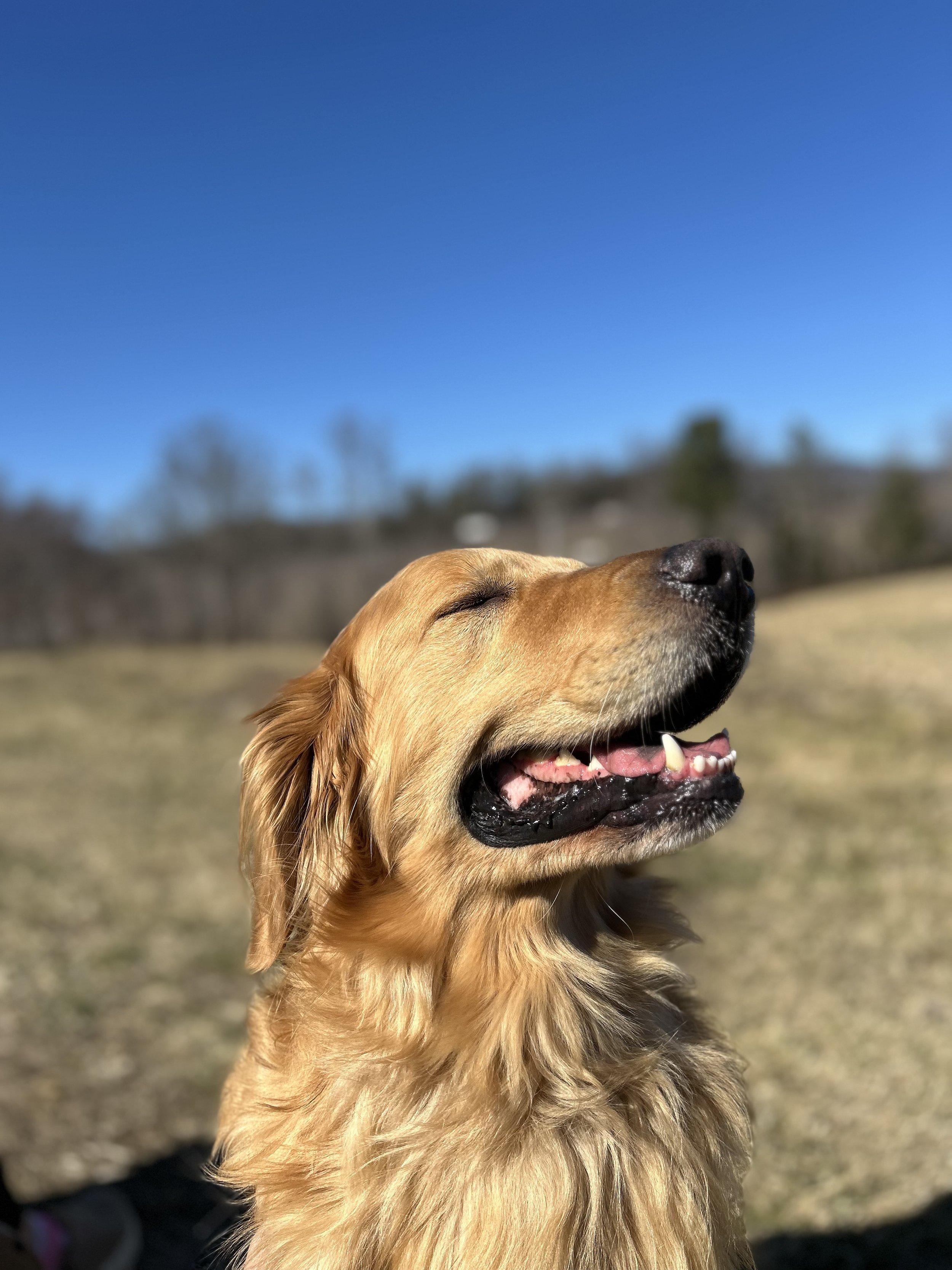 A happy golden retriever with eyes closed enjoying the outdoors under a clear blue sky.