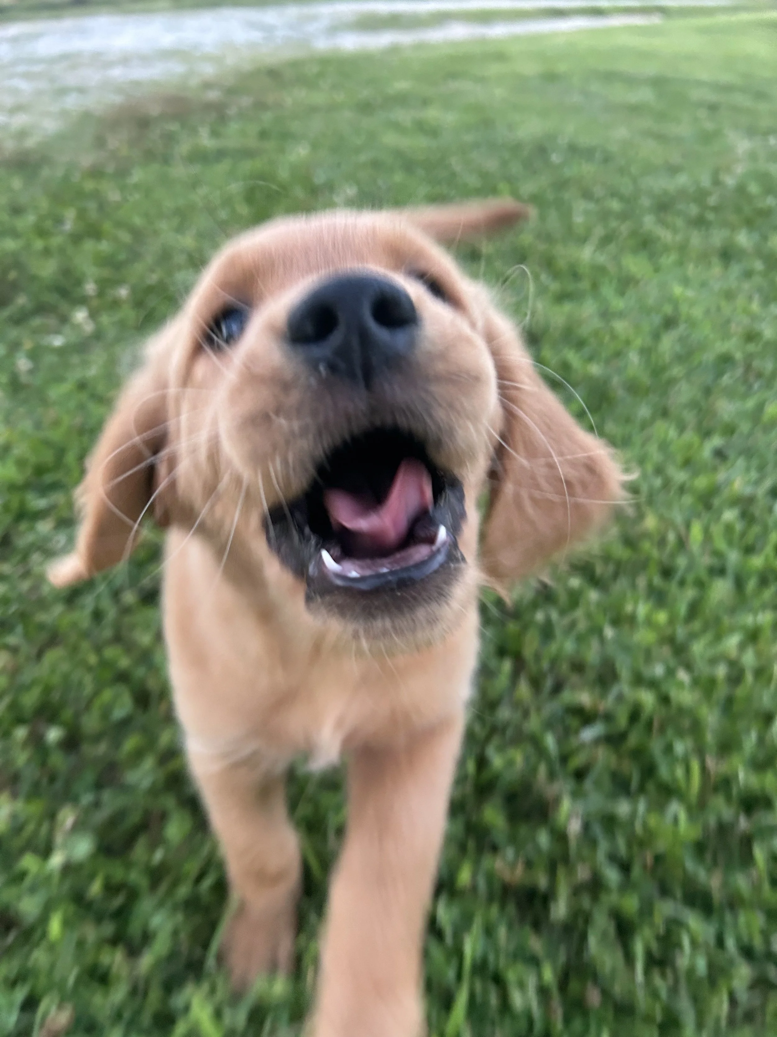 Close-up of a happy golden retriever puppy with open mouth, playful expression, on a grassy field.